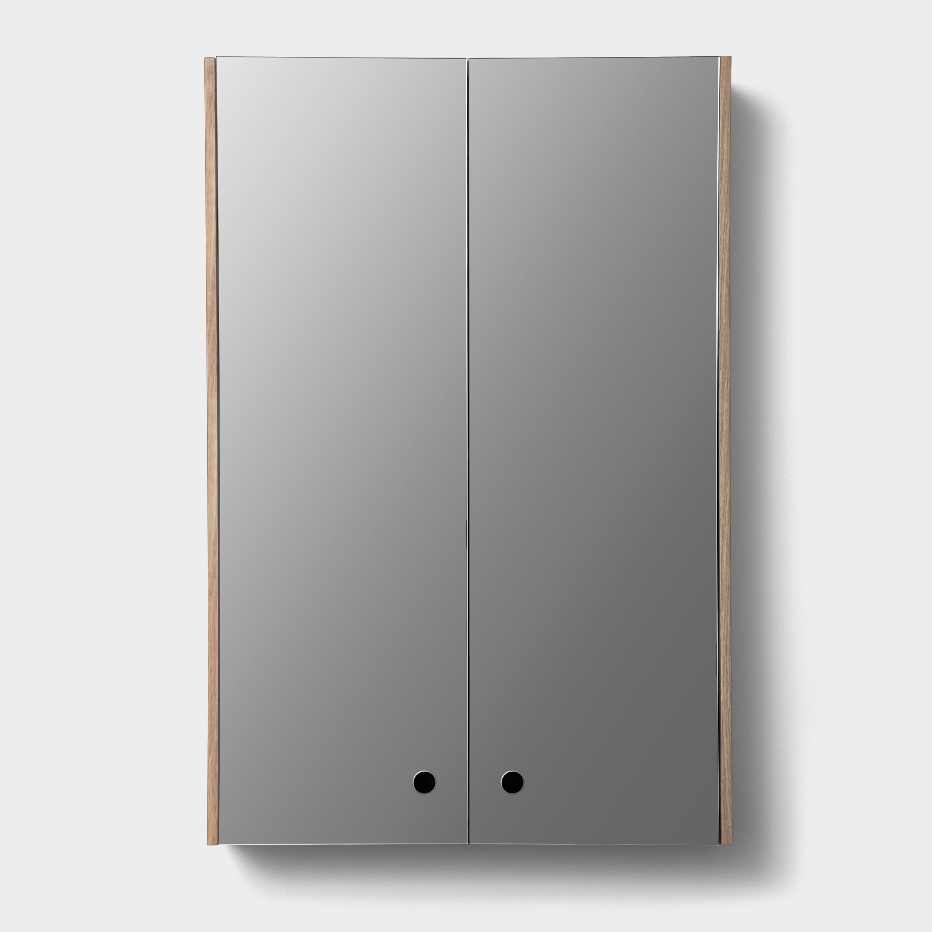 Bathroom cabinet in solid oak. This cabinet is available in two heights and has no back, which saves on material and prevents moisture and dirt from building up behind the mounted cabinet.