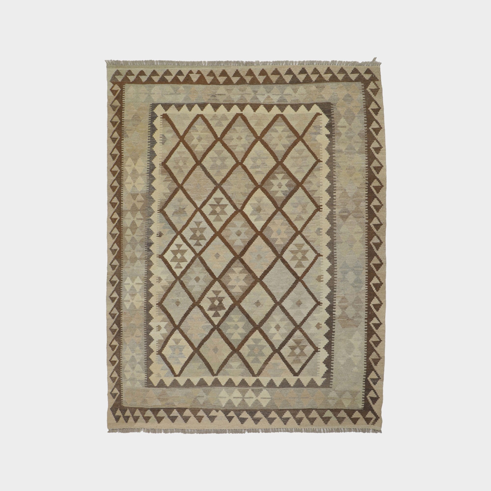 Patterned kilim rug in 100% wool. Manufactured in the Maïmana region in northwestern Afghanistan. The design and pattern are typical of the region and the Turkmen people who inhabit it.