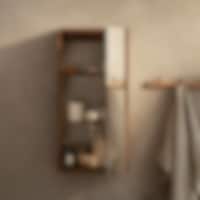 Badrumsskåp i massiv ek. Enkelskåpet finns i två höjder och du väljer själv om luckan ska vara höger- eller vänsterhängd. Skåpet är tänkt att placeras vid sidan av tvättstället. Kombinera gärna med hyllplan och konsoler för öppen förvaring. Skåpet saknar rygg för att spara material samt undvika fukt och smuts bakom det monterade skåpet.